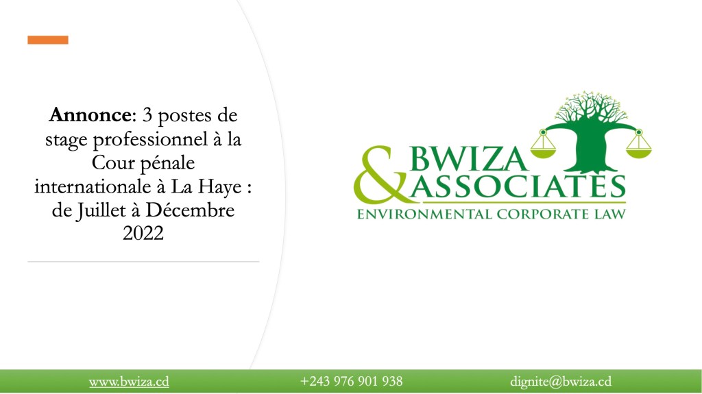 Vous êtes intéressé par le droit pénal international et souhaitez avoir une expérience professionnelle à la Cour Pénale Internationale? Cette opportunité pourrait vous intéresser. Cordialement, le Cabinet d’avocat Bwiza&Associates