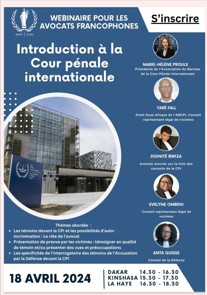 L’Association du barreau près la Cour Pénale Internationale (ABCPI) a organisé le 18 avril 2024 un webinaire portant introduction à la CPI. Dans ce cadre, il m’a été demandé d’intervenir sur le thème “LES TÉMOINS DEVANT LA COUR PÉNALE INTERNATIONALE ET LES POSSIBILITÉS D’AUTO-INCRIMINATION: LE RÔLE DE L’AVOCAT“.